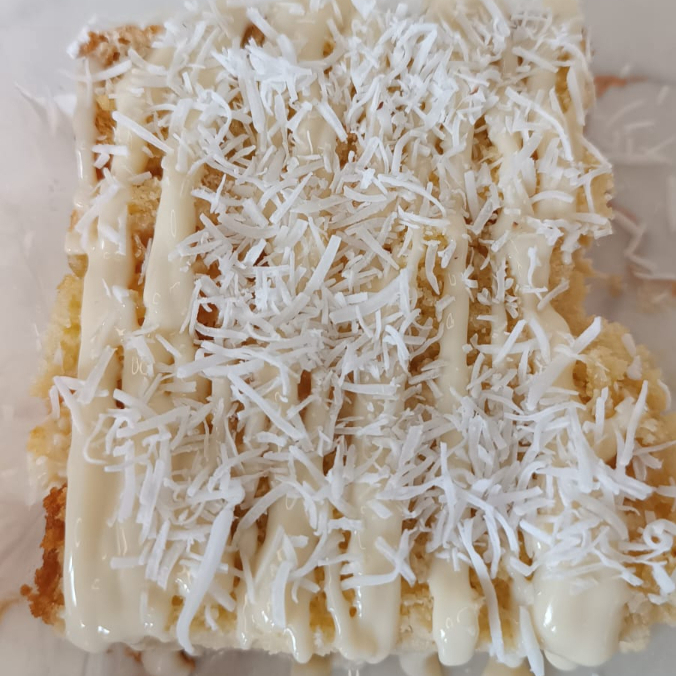 Fatia de bolo de abacaxi com coco, massa úmida e leve, recheio cremoso e pedaços de abacaxi que trazem um sabor refrescante e tropical. Finalizada com coco ralado.