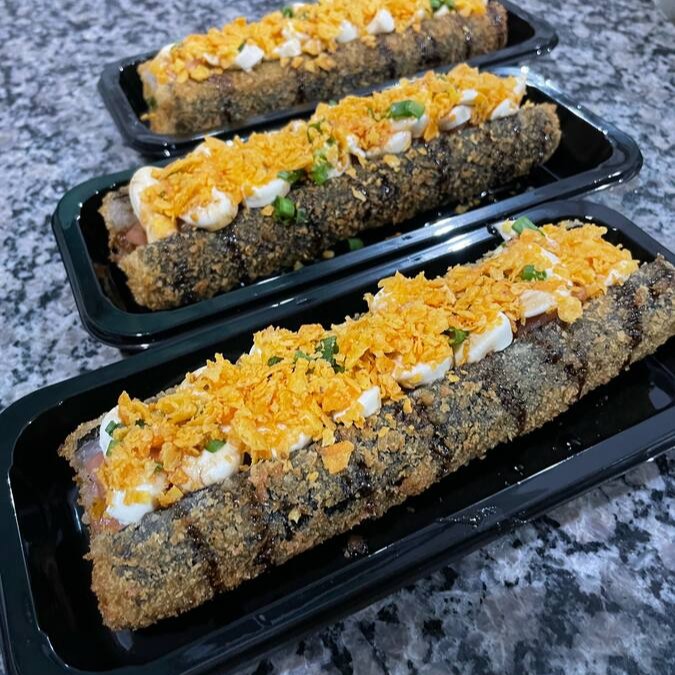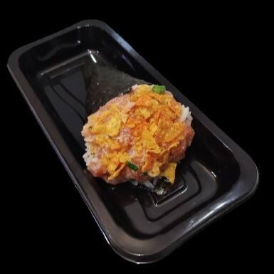 Arroz, salmão, creme cheese, Doritos e pimenta sriracha.