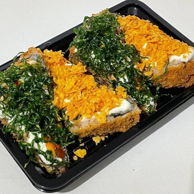4 metades de temaki de salmão grelhado frito, bem recheado com creme chesse, geleia de pimenta, 2 metades com Doritos e duas metades com crispe de couve.