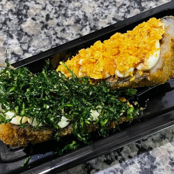 1 temaki grelhado , partido ao meio! Com recheio de creme chesse , geleia de pimenta e crispe de couve e nacho! Podendo variar!
