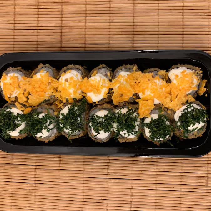 Hot Doritos (8 unidades) : Arroz Recheado de Salmão, Enrolado na Alga com Cream Cheese e Doritos por cima.