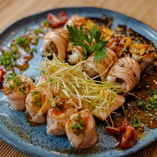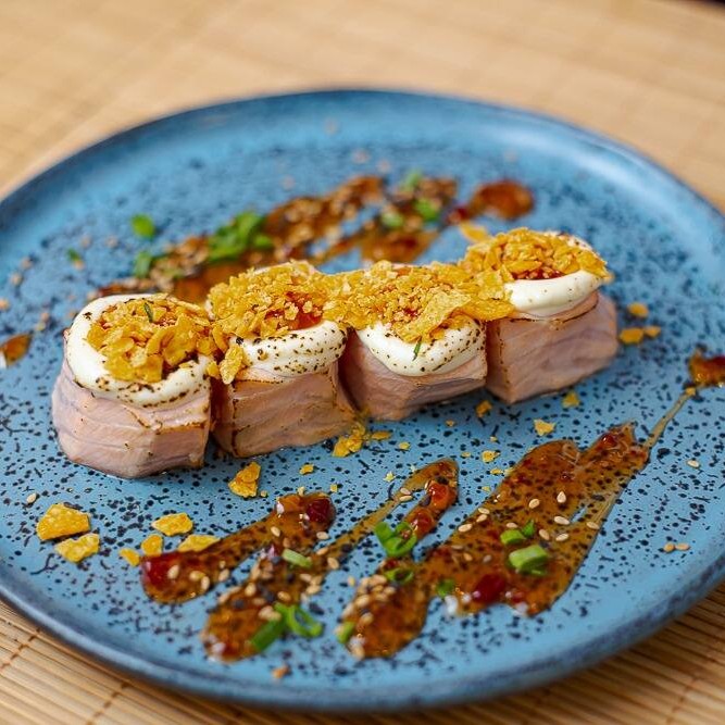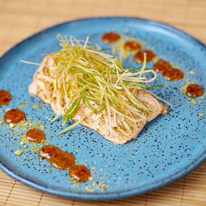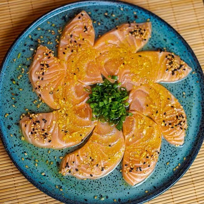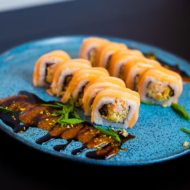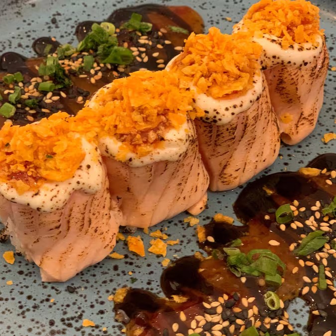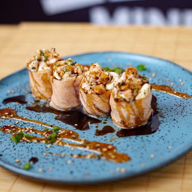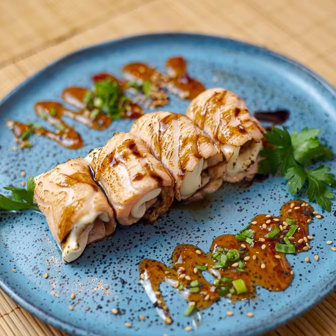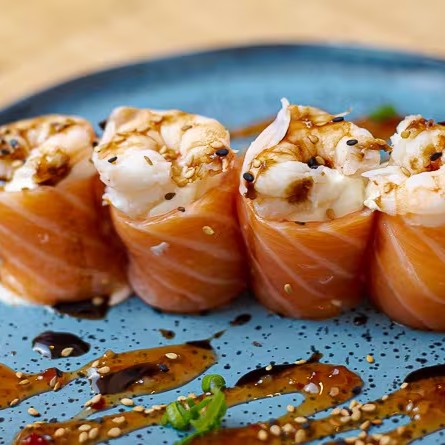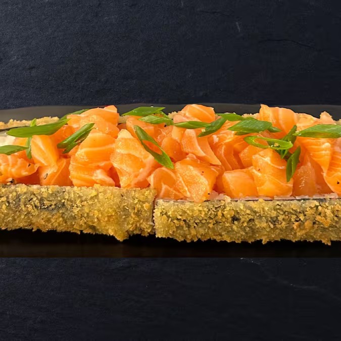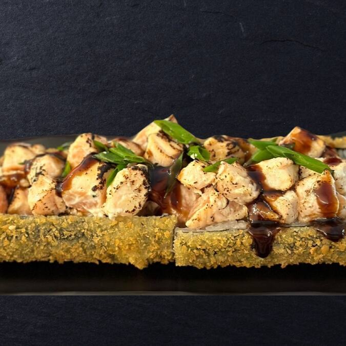 Trata-se de um makimono sublime, cuidadosamente preparado com arroz e recheado com cubos de salmão maçaricados, realçados pelo sabor especial de um autêntico molho teriyaki e finalizado com um toque de cebolinha.