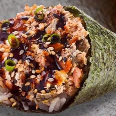 Salmão grelhado, molho tarê, arroz shari e salpicado com cebolinha, envolto no nori (folha da aloga) em formato de cone.