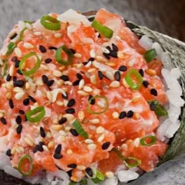 Salmão em cubos com cream cheese , arroz shari e salpicado com cebolinha, envolto no nori (folha de alga) em formato de cone.