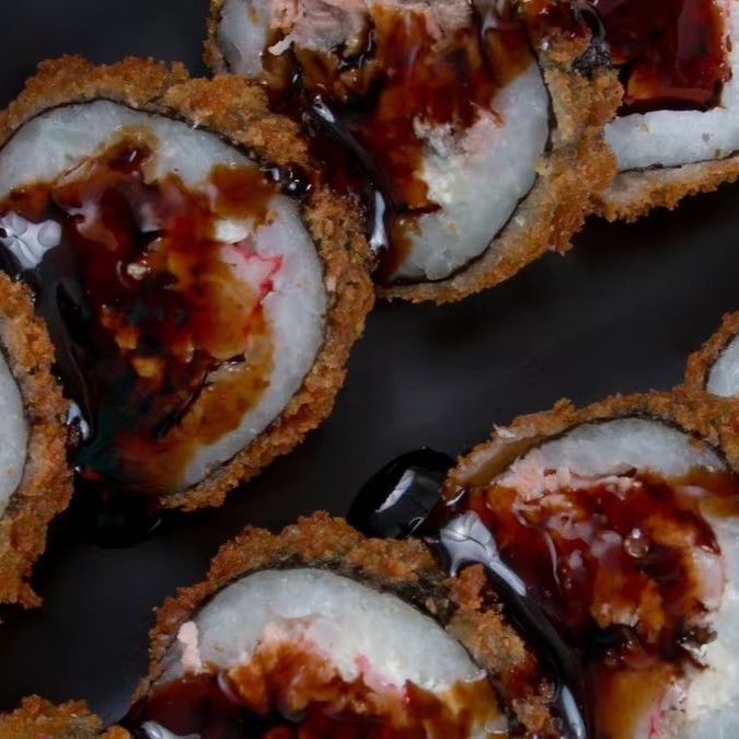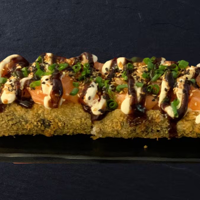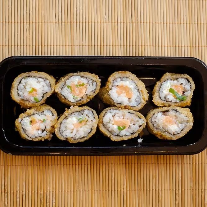 Sushi enrolado com alga por fora, recheio de Salmão com Cream Cheese, empanado e frito.
