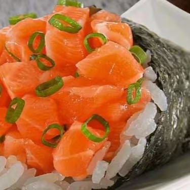 Salmão cortado em cubos, arroz shari e salpicado com cebolinha, envolto no nori (folha de alga) em formato de cone.