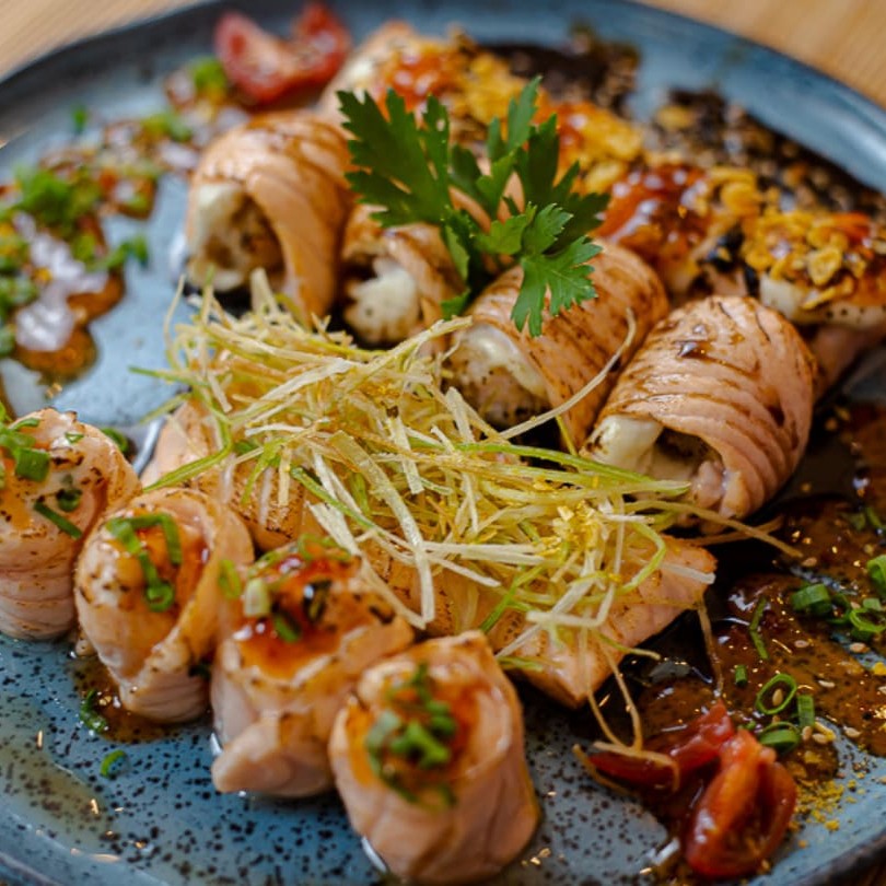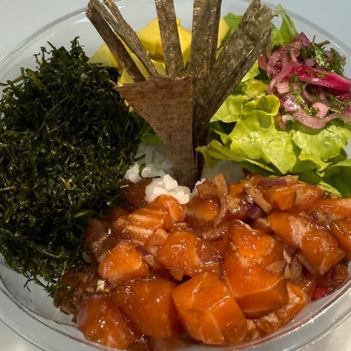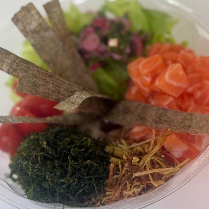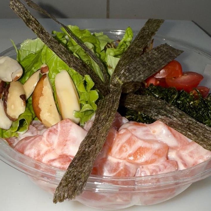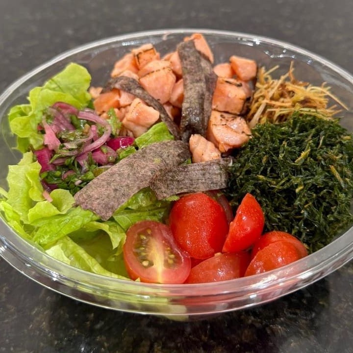 Uma explosão de texturas e sabores! Salmão maçaricado no ponto perfeito, acompanhado de alface fresca, nori, tomatinhos cereja, crisps de alho-poró e couve crocante. Finalizado com cebola cremolata e servido sobre uma base de gorran. Uma combinação irresistível para quem ama sabor com personalidade!