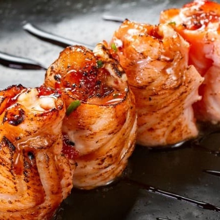 Fatia de Falmão Flambada enrolada no Camarão empanado Crocante e Cream Cheese. Quantidade: 8 Unidades. *Não acompanha (Shoyu,Teriaki, Porta Shoyu e Hashi)*