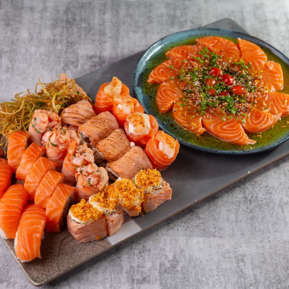 Combinado Loucos por Salmão Quantidade: 49 peças 8 Maki Salmão 8 Maki Philadelfia 8 Uramaki Califórnia 8 Uramaki Philadelfia 8 Uramaki Skin 5 Sashimi 4 Niguiri Salmão *Atenção: Não enviamos (Shoyu,Teriaki, Porta Shoyu e Hashi)* Obs: Não fazemos modificação no Combo.