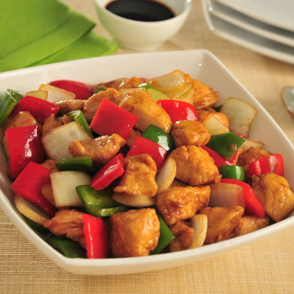 Cubos de file de peito de frango ou molho da casa, com pequenos pedaços de pimentoes e cenoura. Porçao aprox. 300g.
