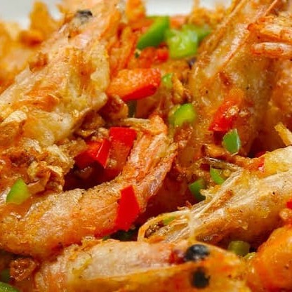 Camarao temperado ao alho frito e pimentoes coloridos, porçao em media 250g
