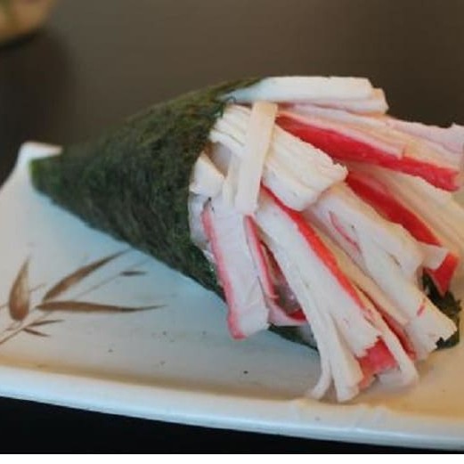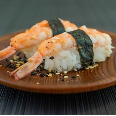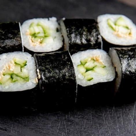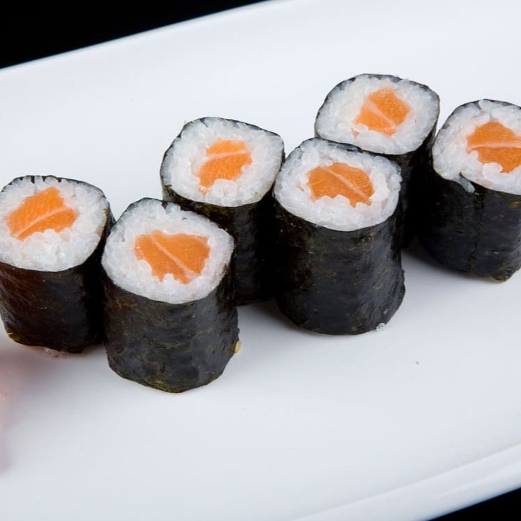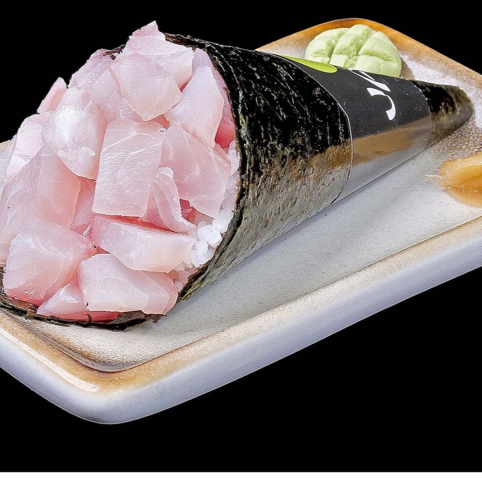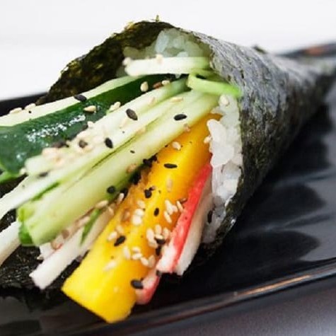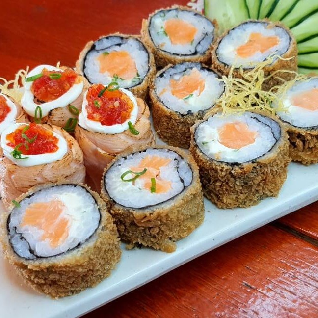 Alga marinha, arroz, camarão, atum, peixe branco, salmão, kani, cream cheese e cebolinha.