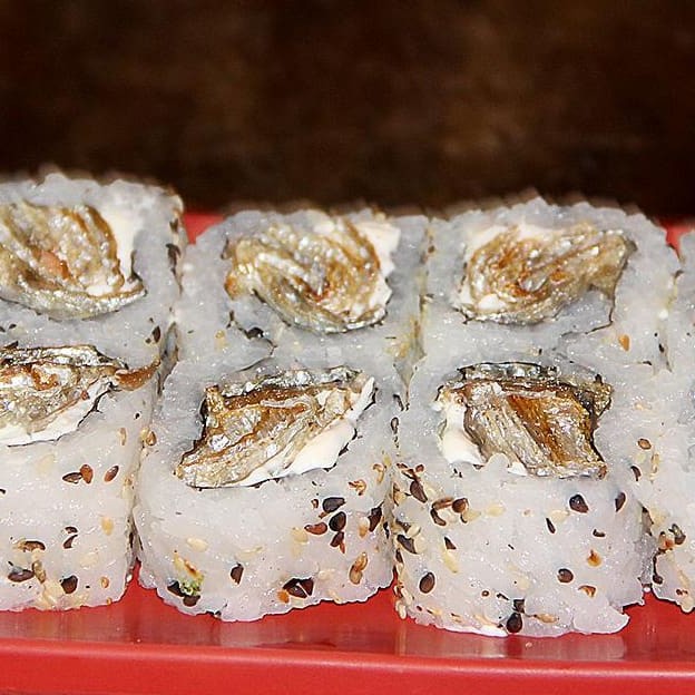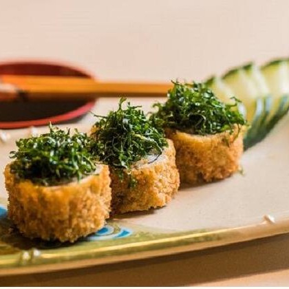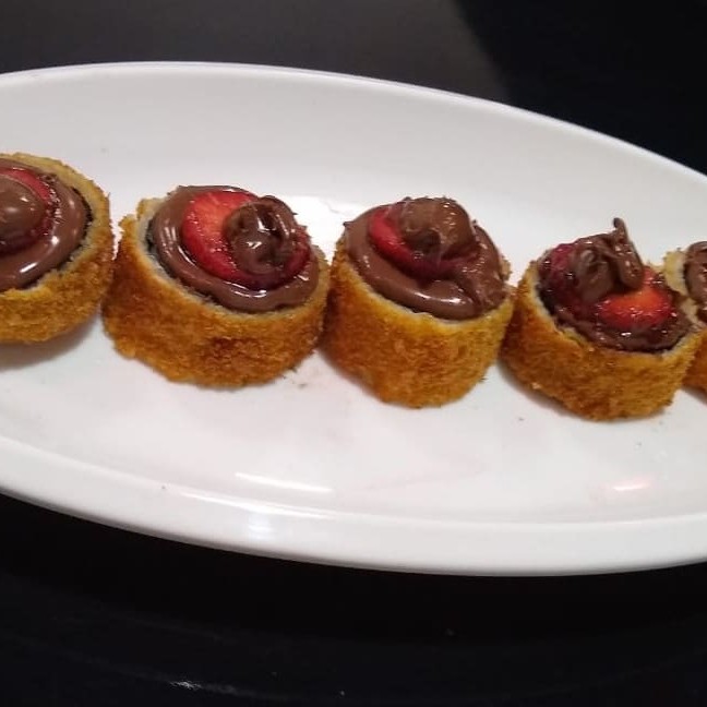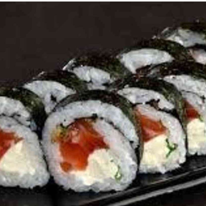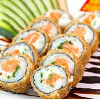 Alga marinha, arroz, cream cheese, cebolinha, salmão empanado e frito.