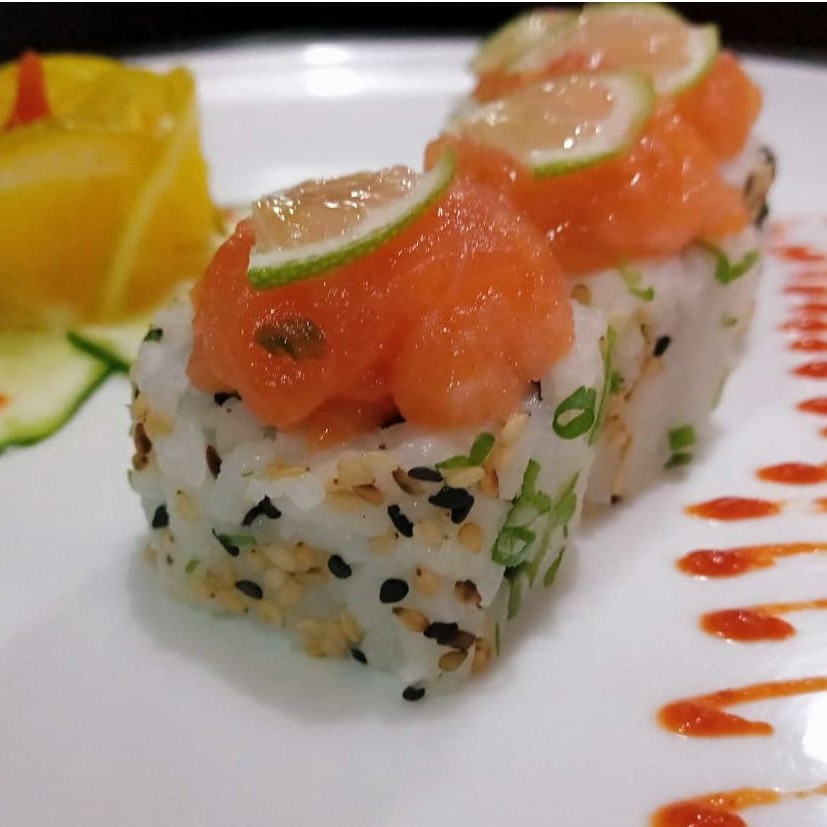 Uramaki de salmão com Tartar de salmão, e finalizado com uma lâmina de limão