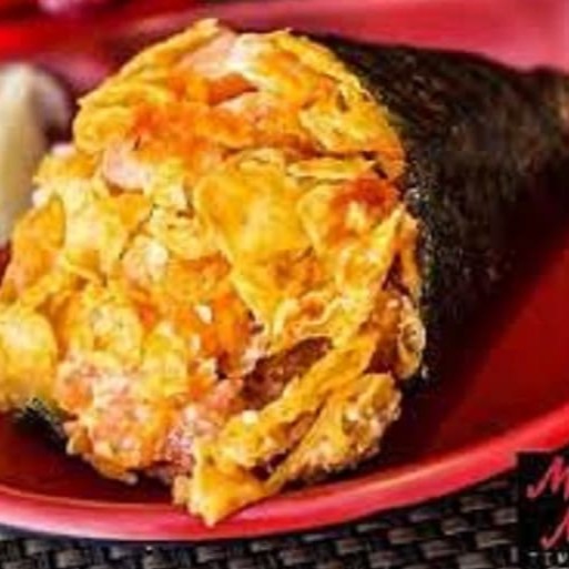 Alga marinha, arroz, salmão, cream cheese, Doritos, cebolinha e pimenta tabasco.