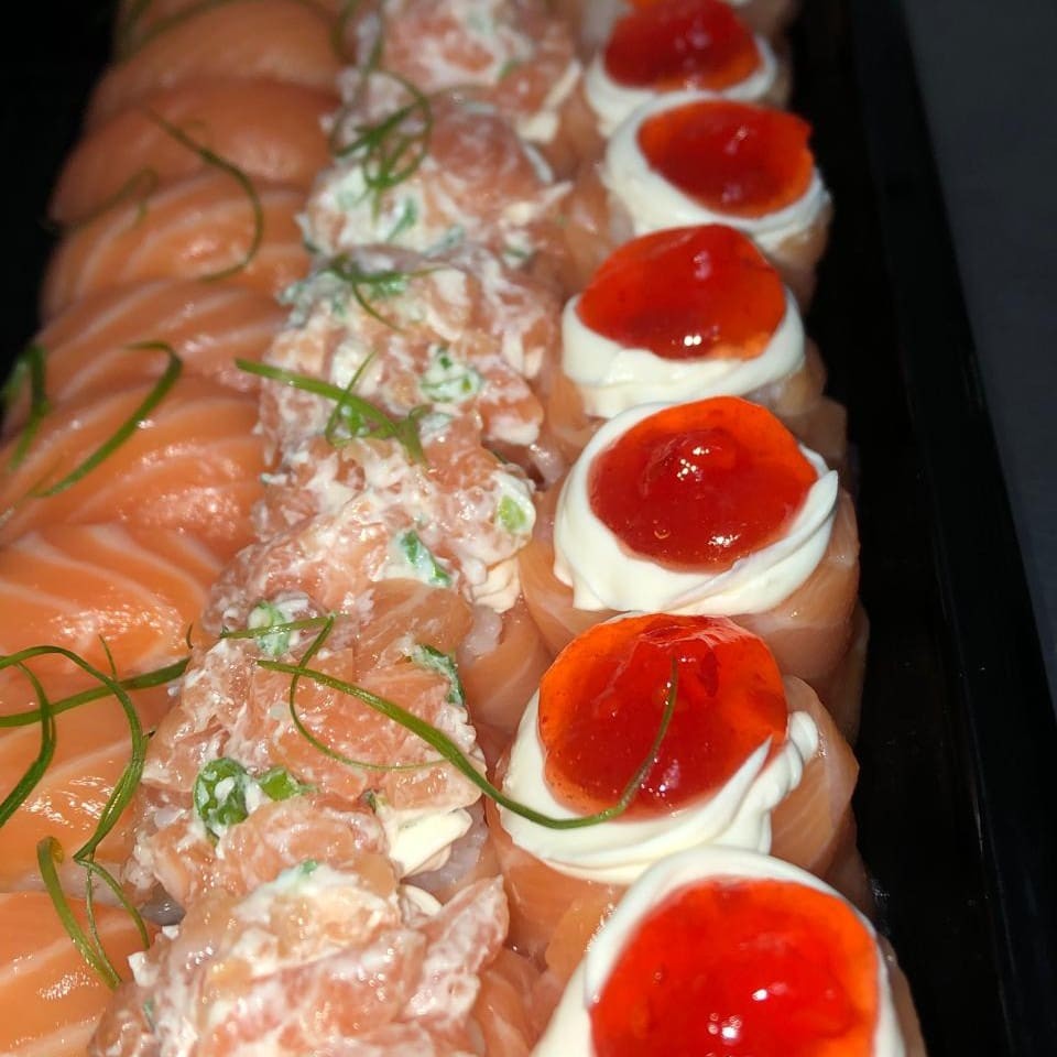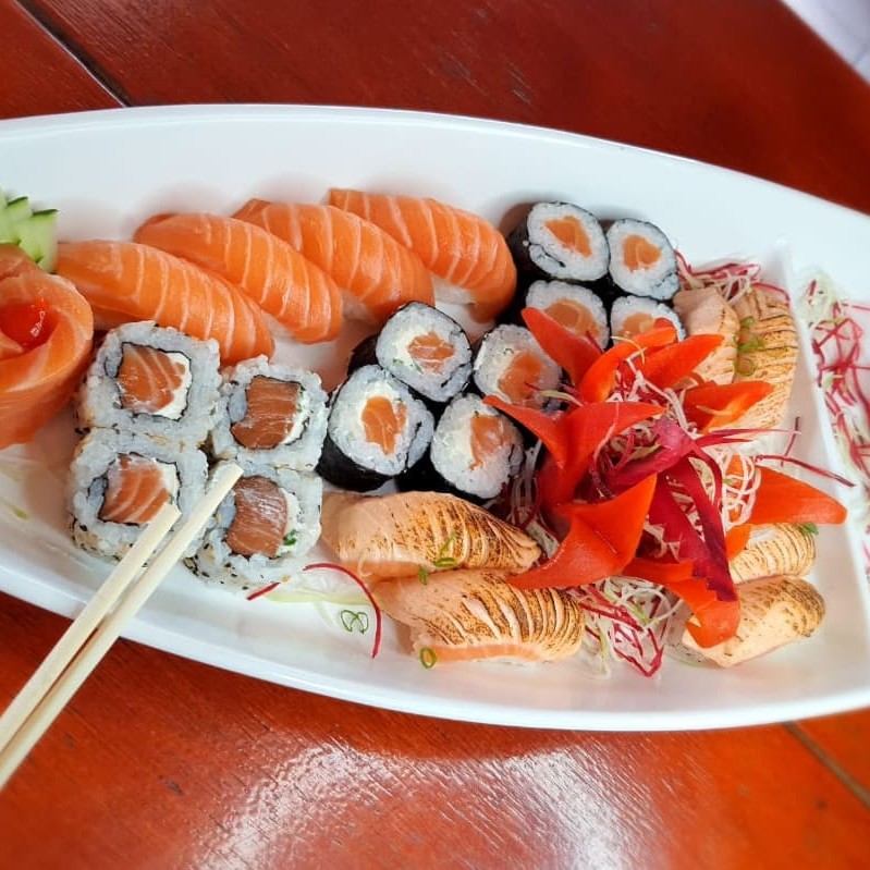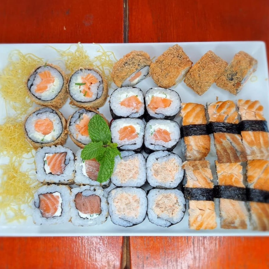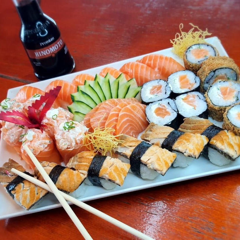 4 sashimi salmão, 6 niguiri salmão, 4 hot philadelfia, 4 maki philadelfia, 6 gunkan de salmão e 6 sushi skin.