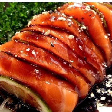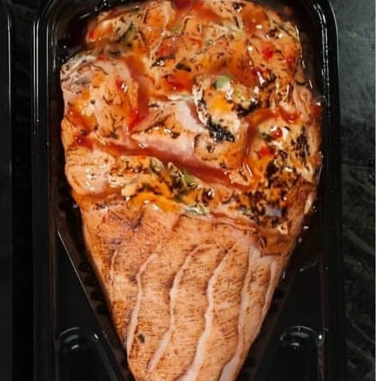 Filé de salmão grelhado ( 5 pedaços de salmão grelhado com geleia de pimenta gergelim e cebolinha .