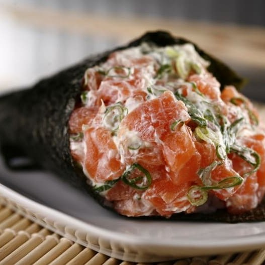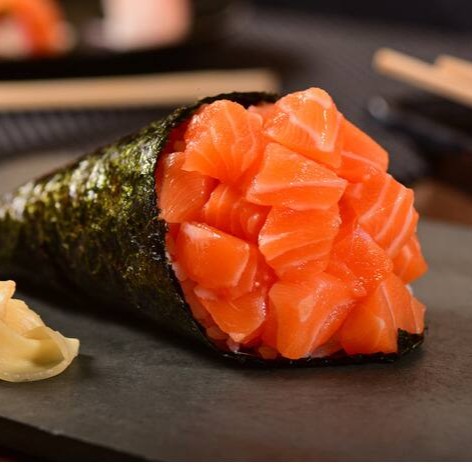 Temaki feito com massa hukamak, recheado com salmão grelhado , cream cheese, finalizado com uma leve camada de geleia de pimenta. * Sem arroz