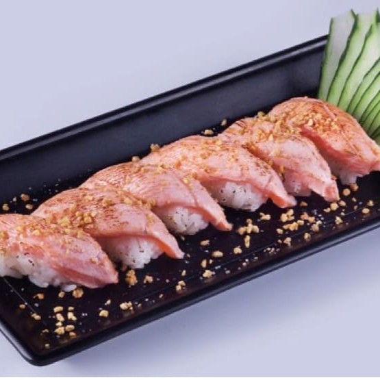 8 gunkan salmao, 8 gunkan flambado com geleia de pimenta e 8 niguiri salmao.