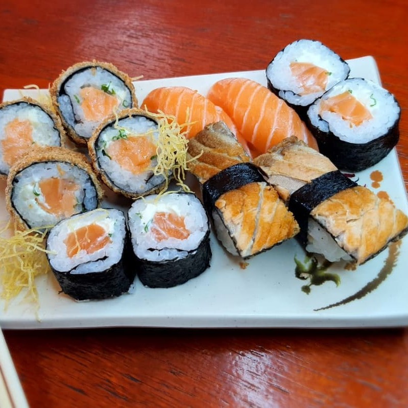 2 sashimi salmão, 4 niguiri salmão, 4 maki salmão, 6 niguiri salmão flambado, 4 uramaki Philadelphia e 4 maki philadelfia.
