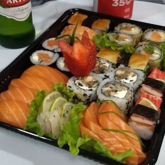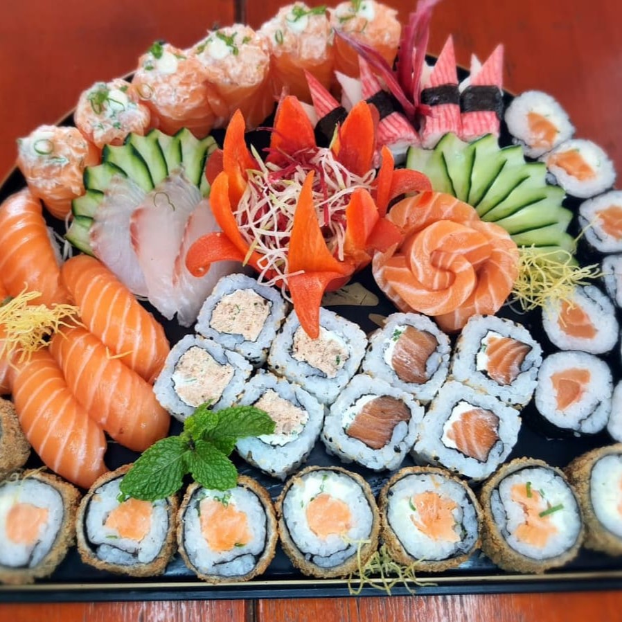 4 sashimi salmão, 2 sashimi peixe branco, 5 niguir salmão, 4 suhi kani, 8 hot philadelfia, 4 maki salmão, 4 maki philadelfia, 4 uramaki philadelfia, 6 gunkan e 4 uramaki skin.
