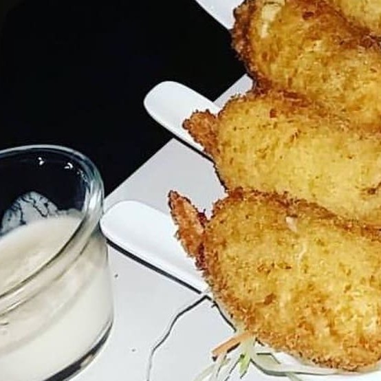 Enrolado de camarão com cream cheese e e cebolinha, empanado e frito.
