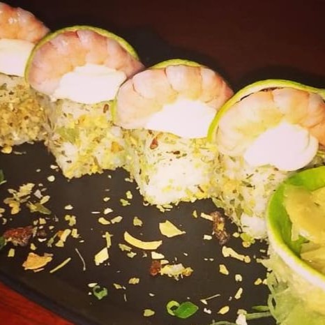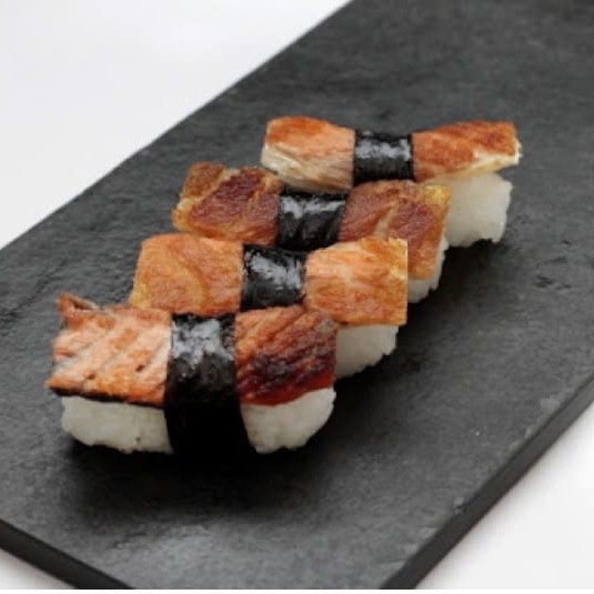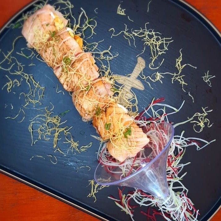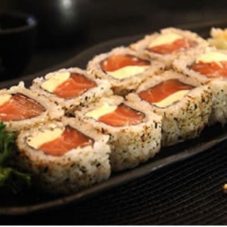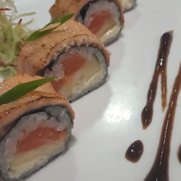 Maki tropical recheado com salmão, cream cheese e abacaxi. Envolto com uma lâmina de salmão flambado.