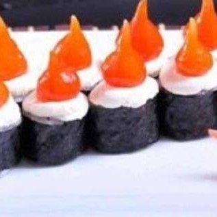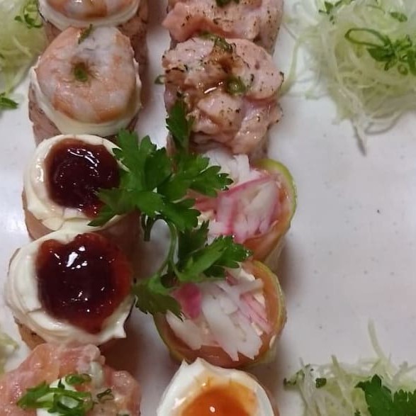 2 gunkans de geleia de pimenta, 2 gunkan de goiabada 2 gunkan de geleia de morango 2 gunkan lemon 2 gunkan camarão 2 gunkans de salmão 2 gunkan de salmão flambado.
