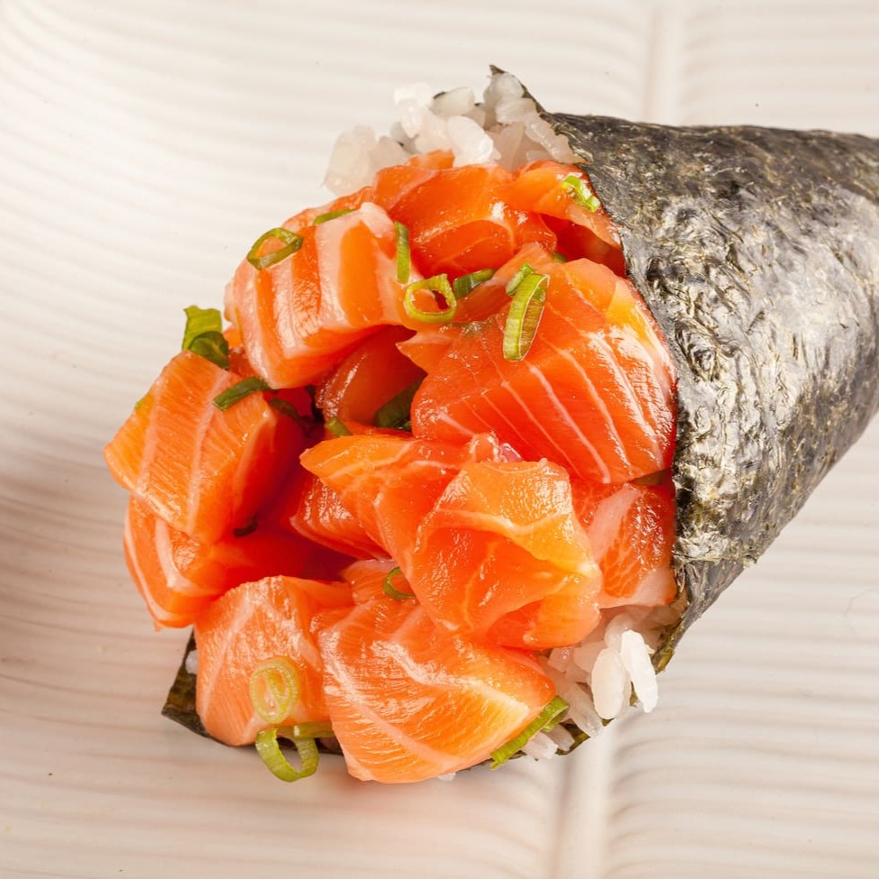 Sushi enrolado à mão em forma de cone, feito com arroz, alga marinha, recheado com salmão. **Foto real do King Japa