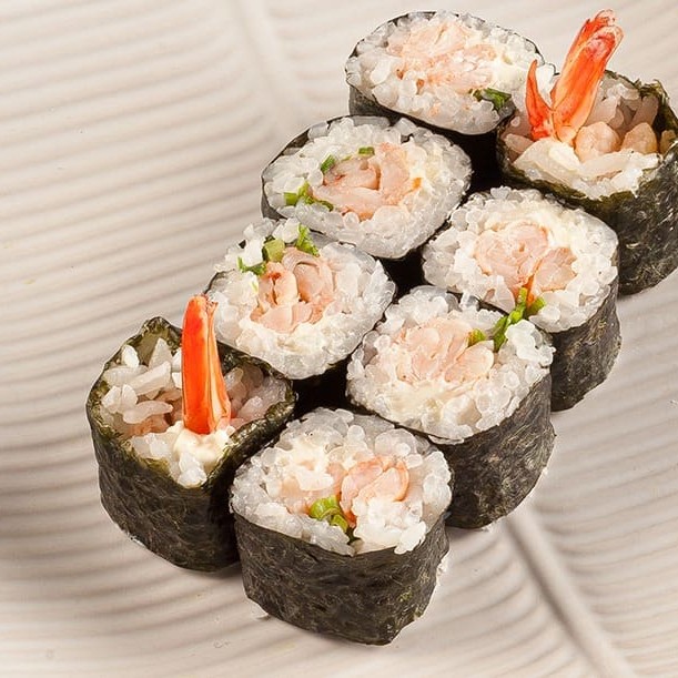 Uma versão do sushi que utiliza camarão como ingrediente principal. **Foto real do King Japa