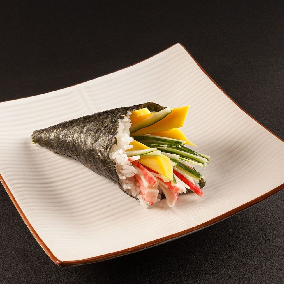 Enrolado de alga em forma de cone, recheado com arroz, pepino, manga e kani. É uma opção clássica e saborosa, que equilibra sabores doces e suaves. ** Se você não come carne, peça para tirar o kani. **Foto real do King Japa