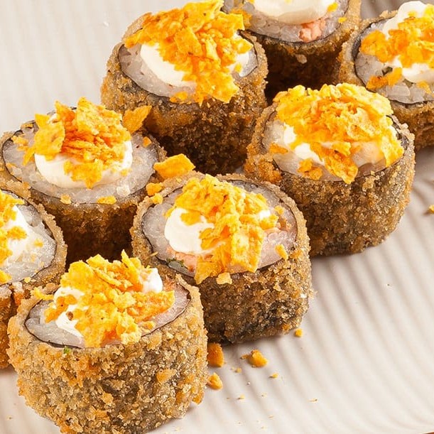 Sushi empanado e frito, feito com cream cheese, arroz, alga nori e Doritos.
