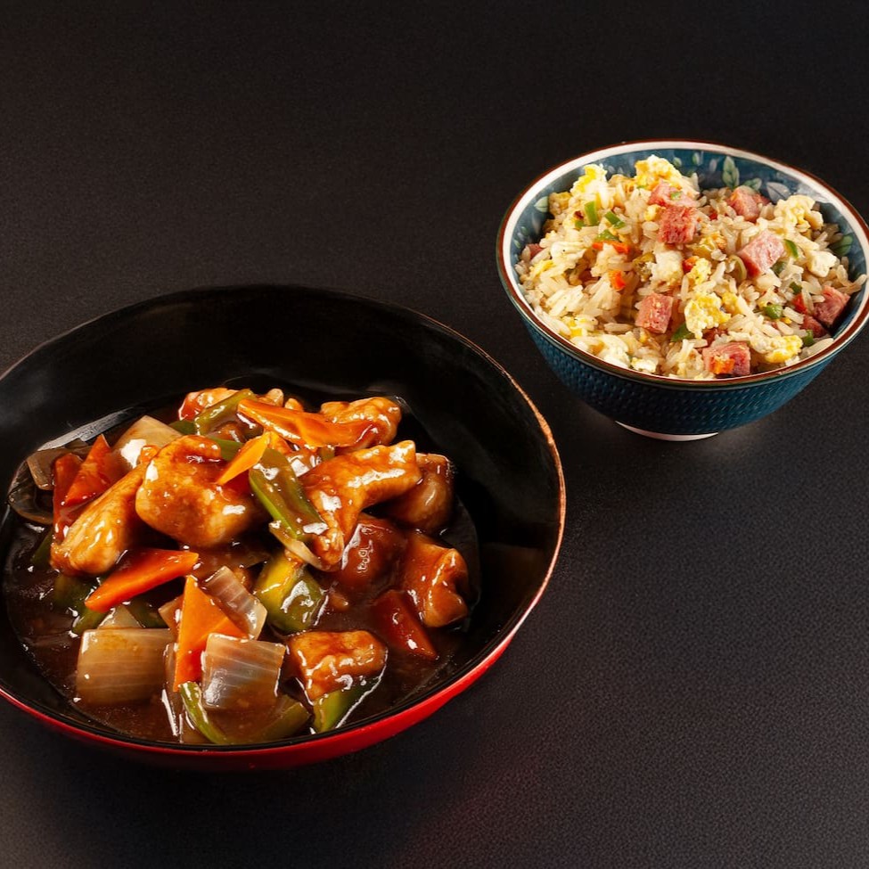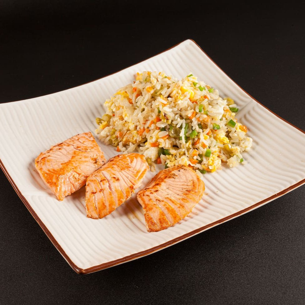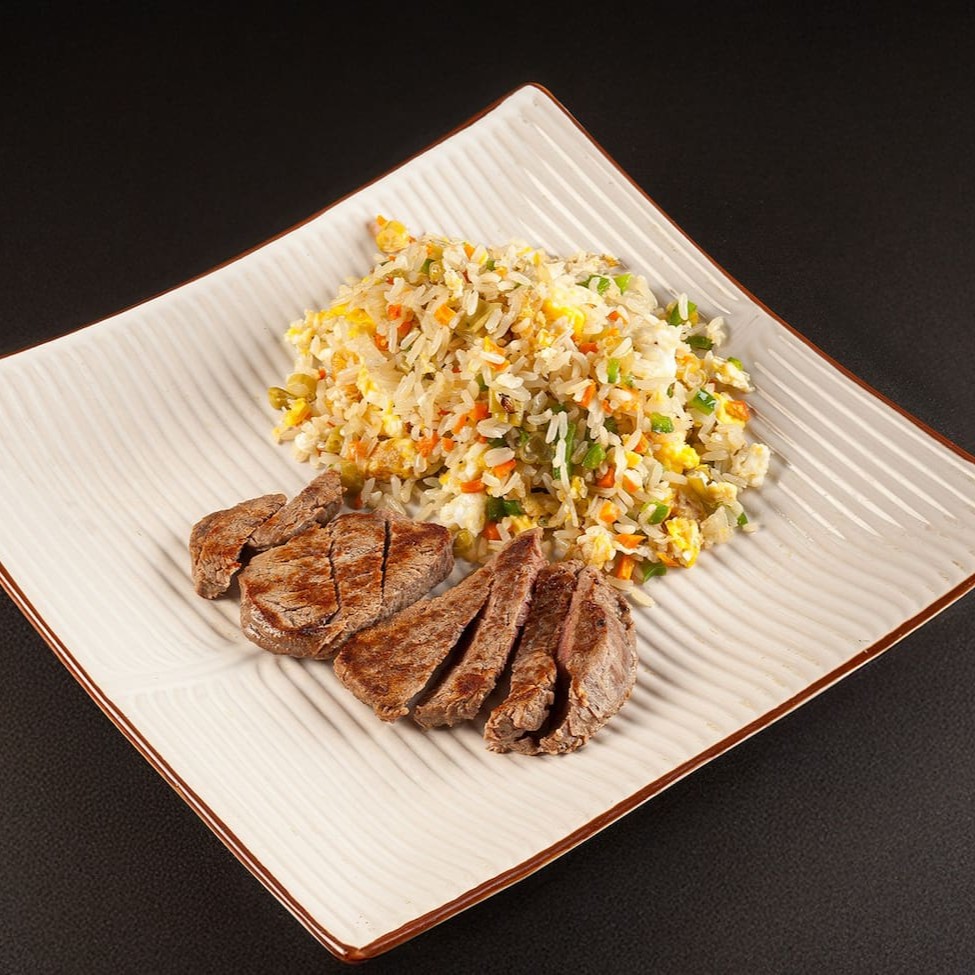 Arroz frito, proteína, ovos mexidos e legumes. **Foto real do King Japa