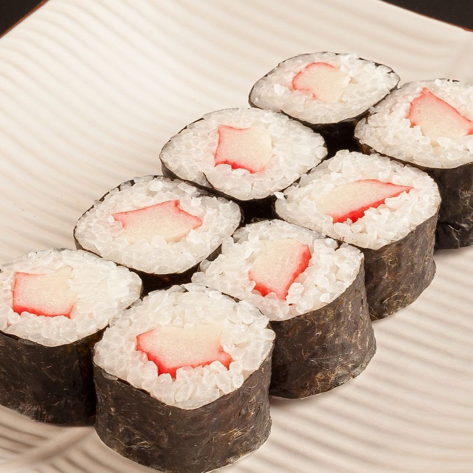 Enrolado de alga, recheado um bastão de carne de peixe prensada que imita o caranguejo. **Foto real do King Japa