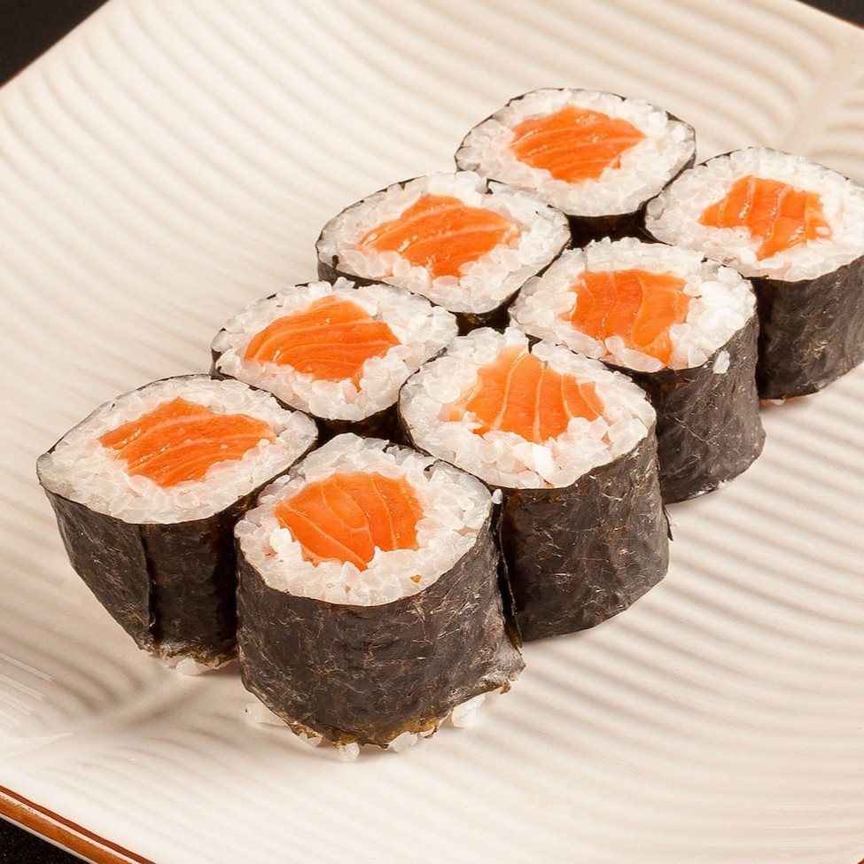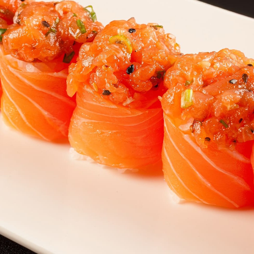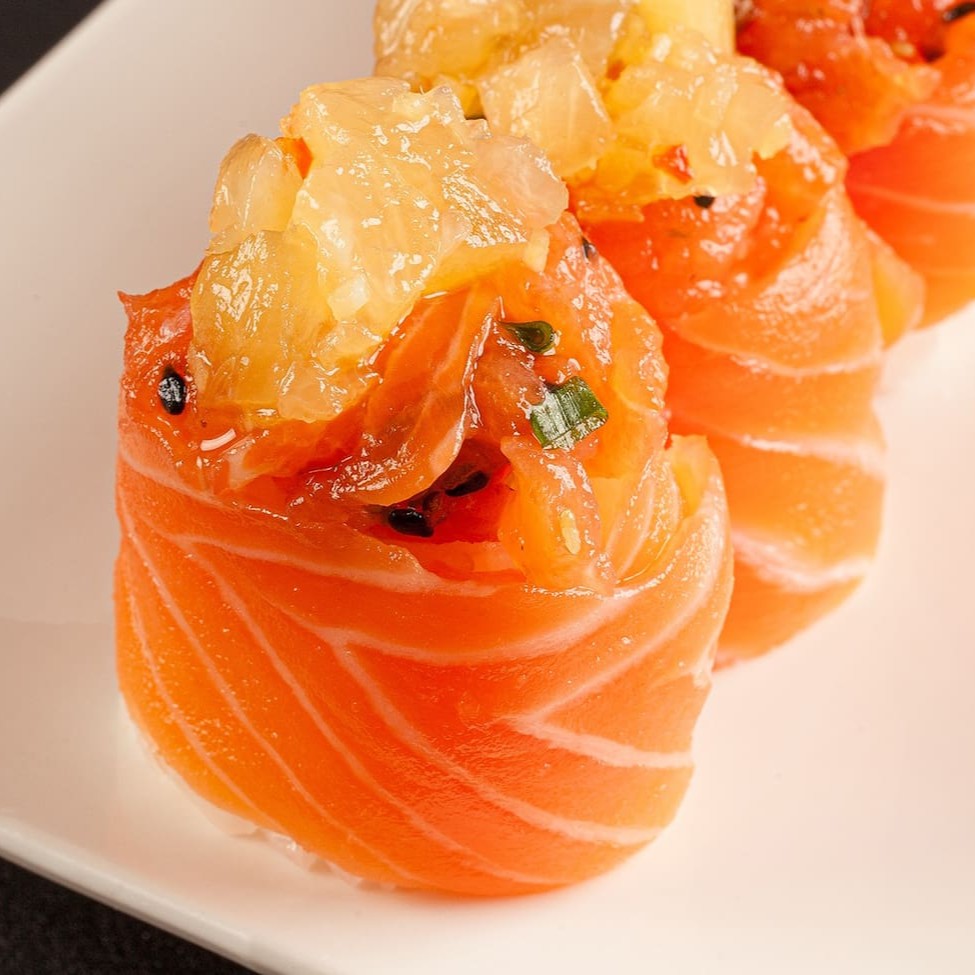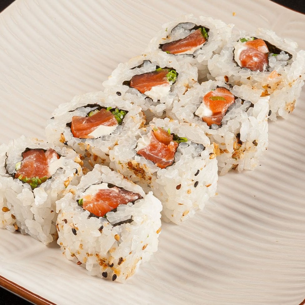 Sushi que consiste em salmão fresco envolto em arroz e geralmente é coberto com gergelim. (Não acompanha molhos e nem hashi)