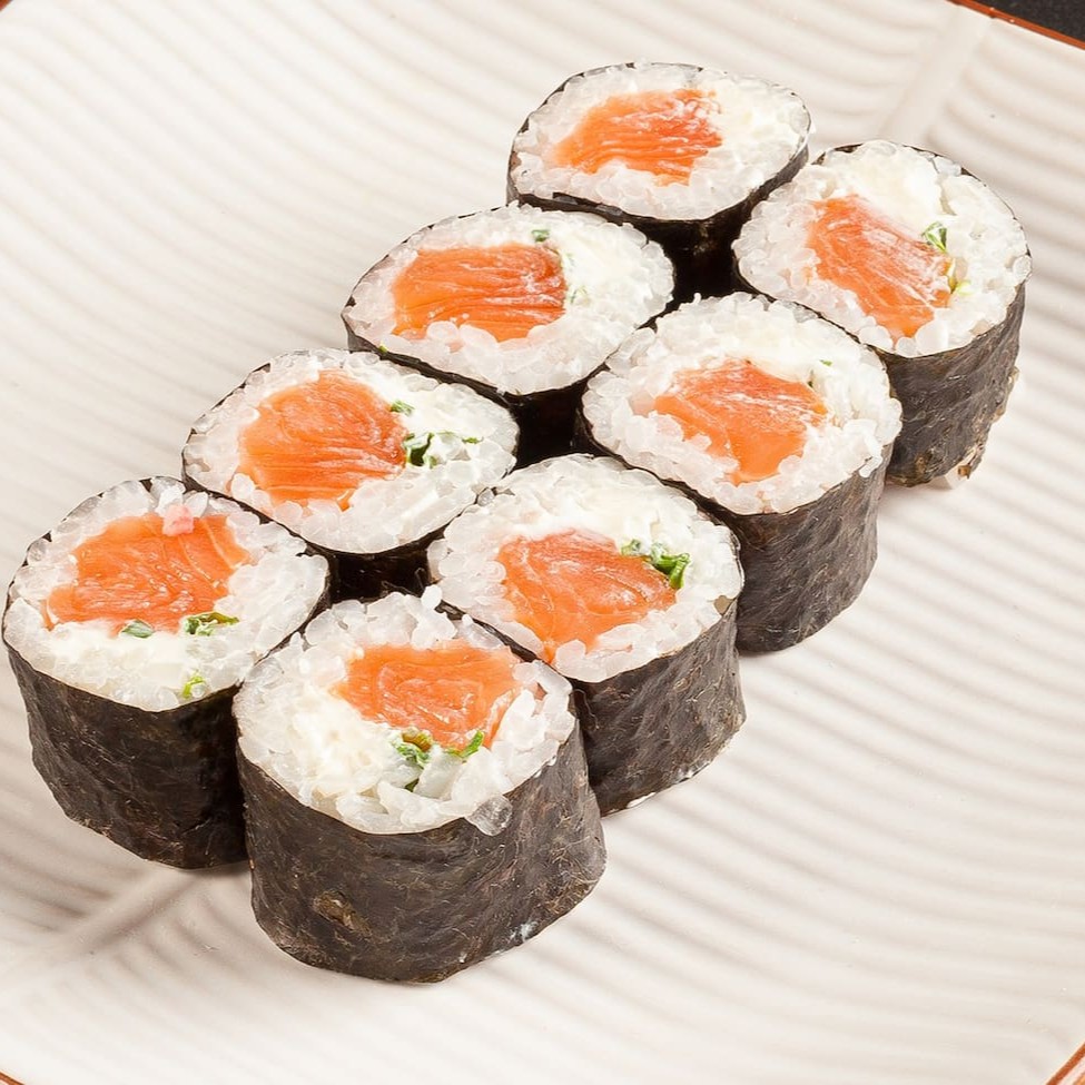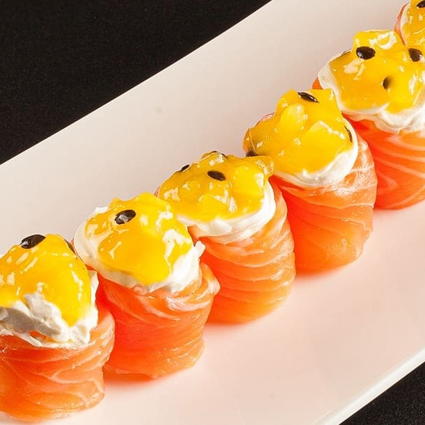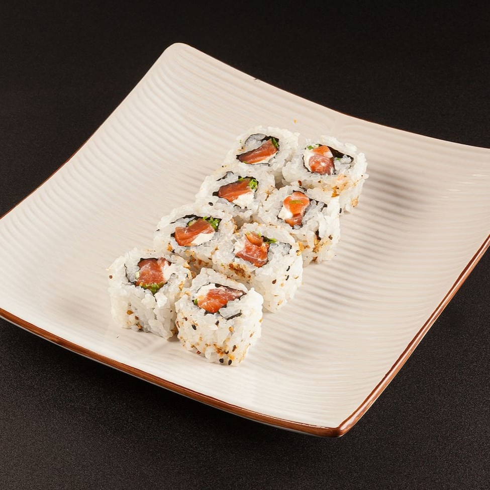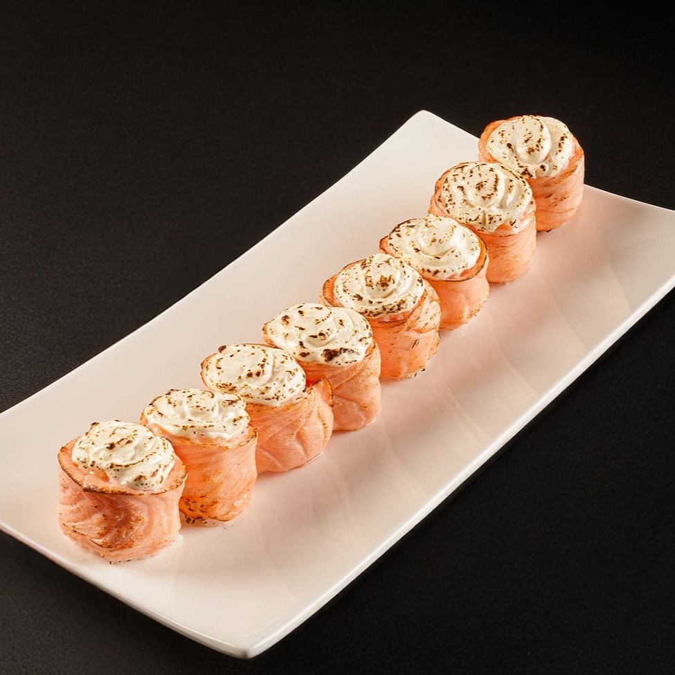 Sushi que consiste em salmão fresco envolto em arroz e geralmente é coberto com gergelim. (Não acompanha molhos e nem hashi)