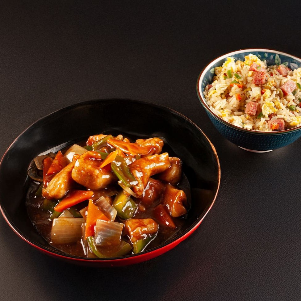 Frango, Cebola, Pimentão, Cenoura. **Acompanha arroz, Chop suey ( arroz cozido com legumes e ovos) **Foto real do King Japa