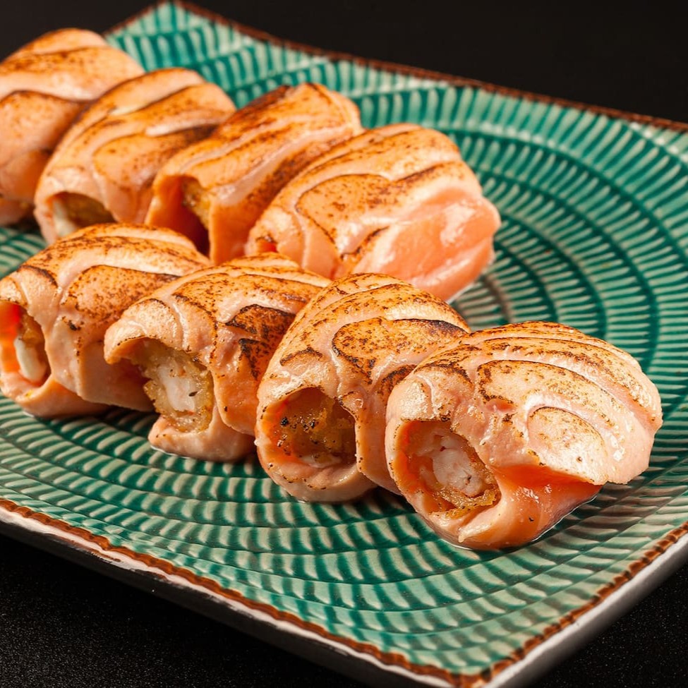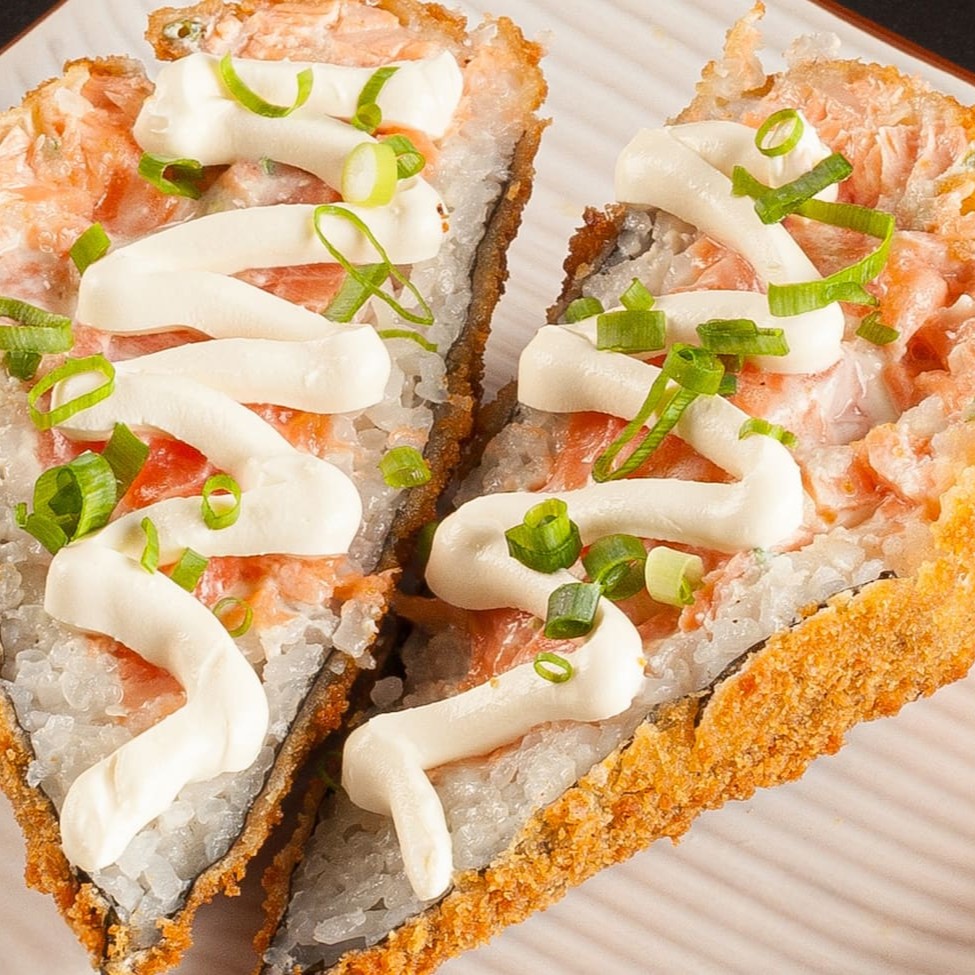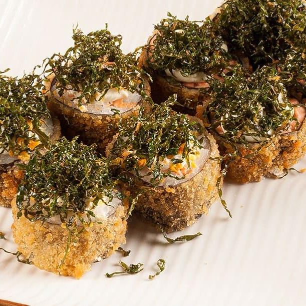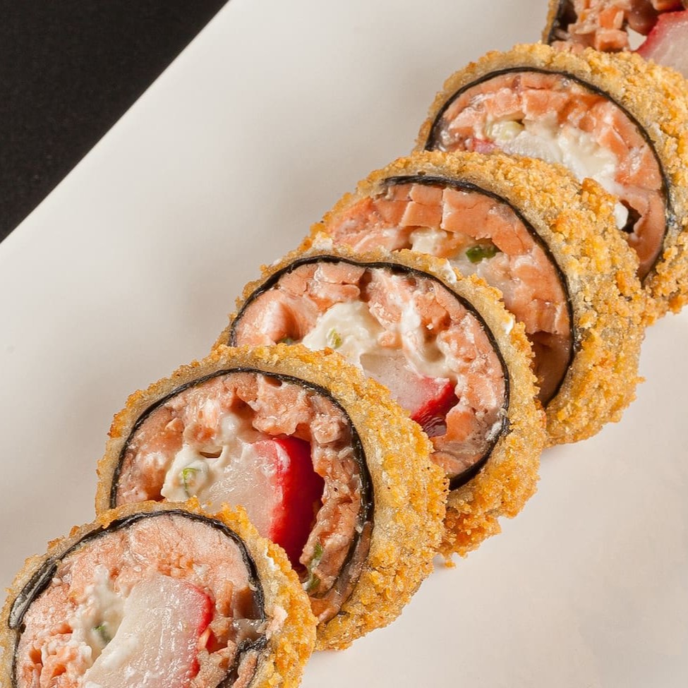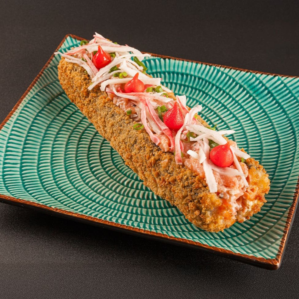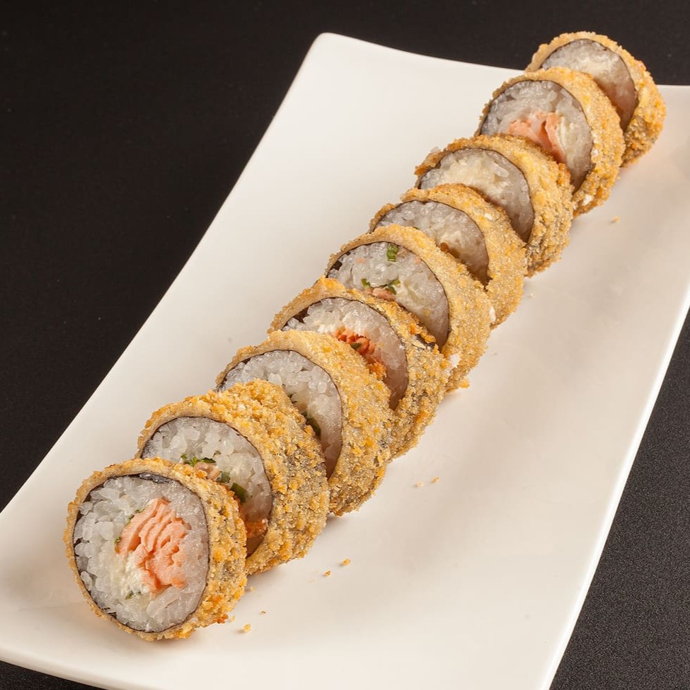 Sushi empanado e frito, feito com salmão, cream cheese, arroz, alga nori e farinha de trigo.