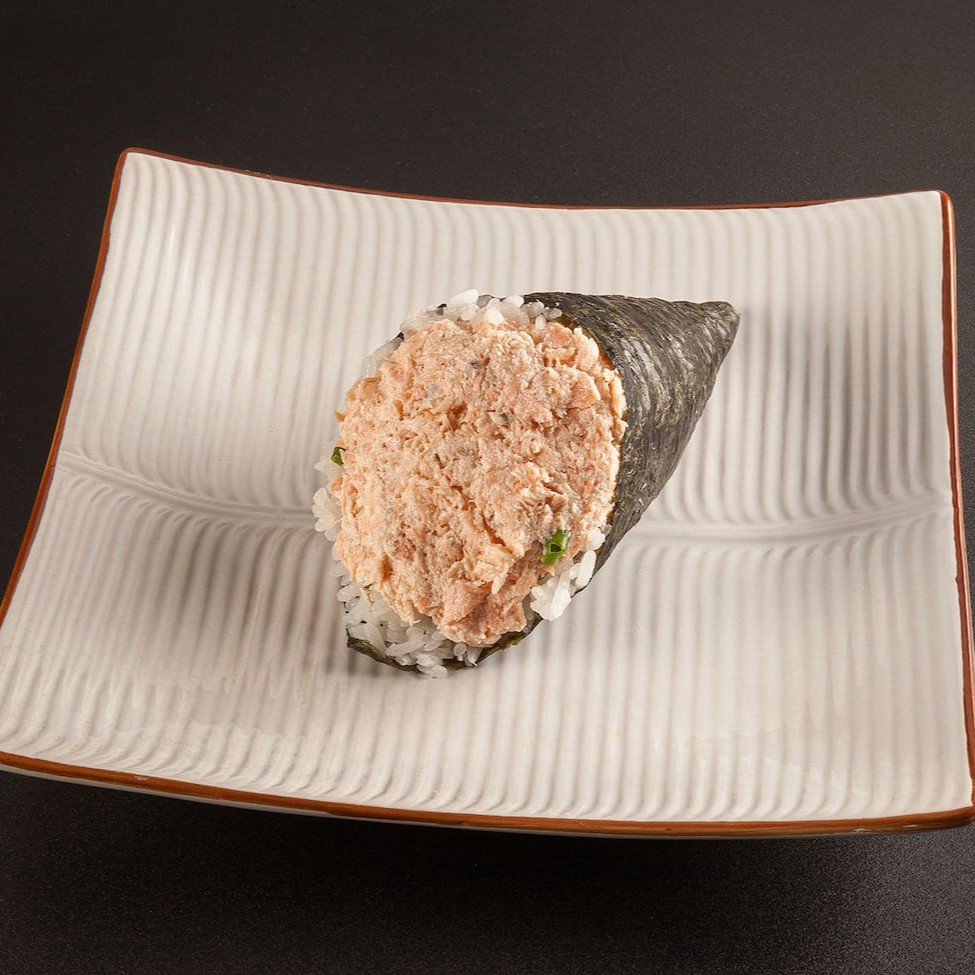 Sushi enrolado à mão em forma de cone, feito com arroz, algas marinhas.