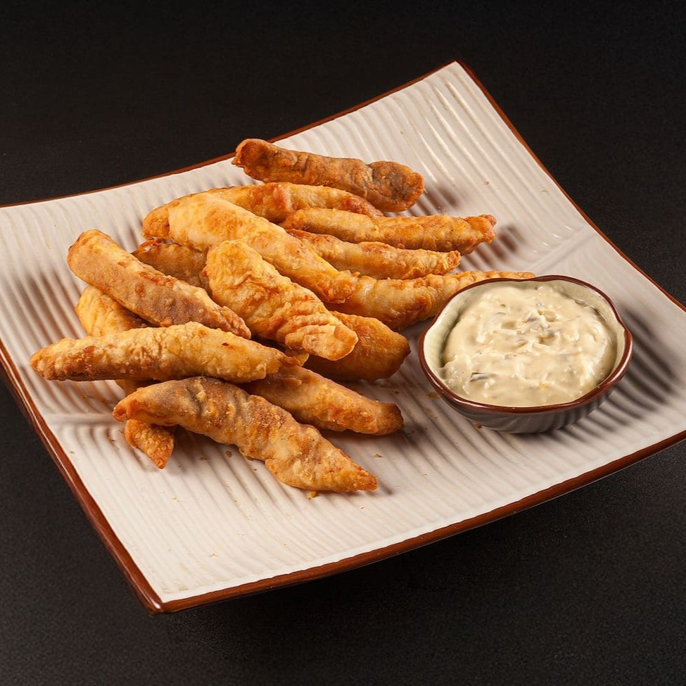 Pedaços de peixe, empanados e fritos.