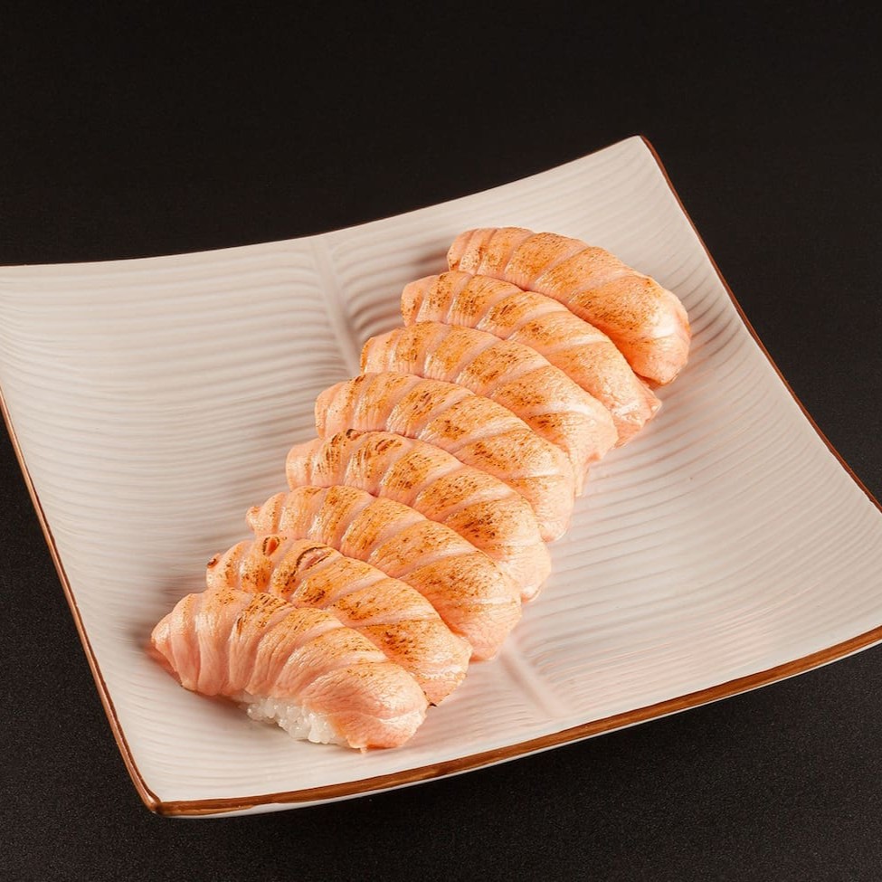 Sushi feito com uma fatia de peixe cru e levemente maçaricado para aquecer a superfície do peixe. **Foto real do King Japa