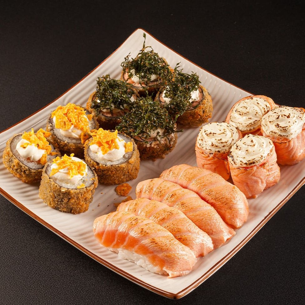 02 Sushi Salmão 02 Sushi Salmão Maçaricado 02 Sushi Skin 2 Joy Cream Cheese Maçaricado 02 Uramaki Salmão Grelhado **Foto real do King Japa
