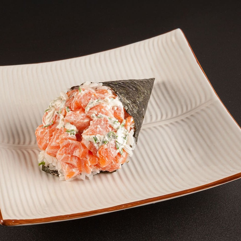 Sushi enrolado à mão em forma de cone, feito com arroz, alga marinha, recheado com salmão e cream cheese. **Foto real do King Japa