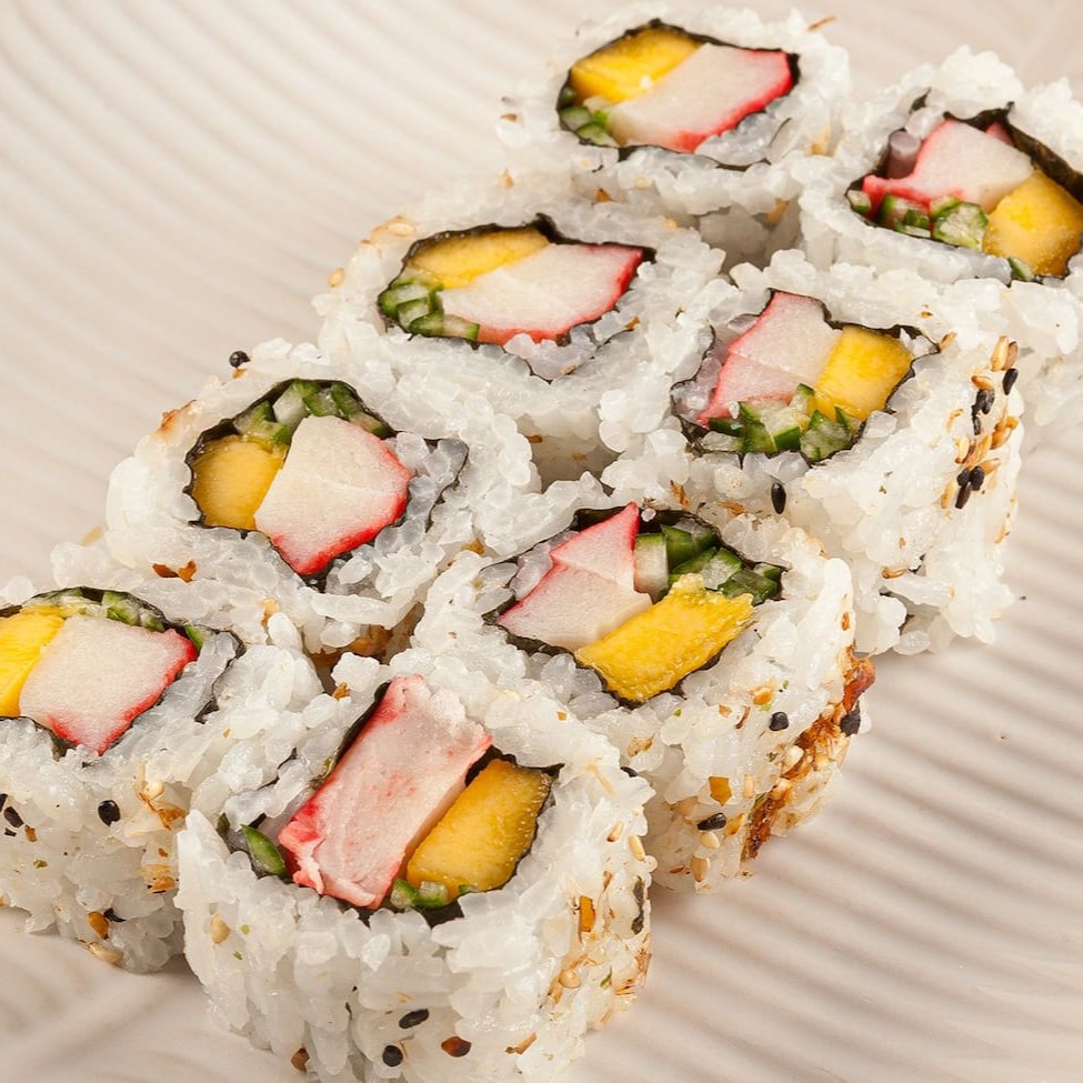 Alga nori, arroz japonês, manga, pepino e kani. ***Vegano e Vegetariano: peça sem Kani **Foto real do King Japa