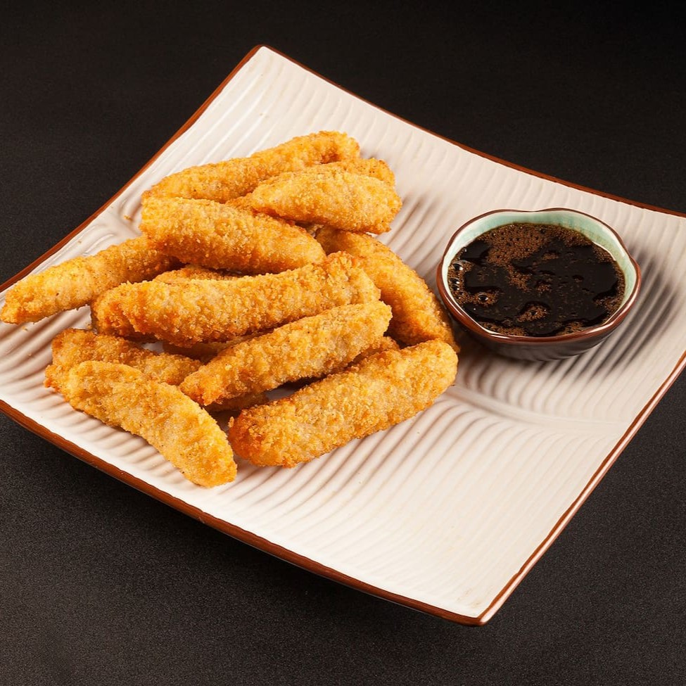 Iscas de peito de frango, envolto na farinha panko. **Foto real do King Japa