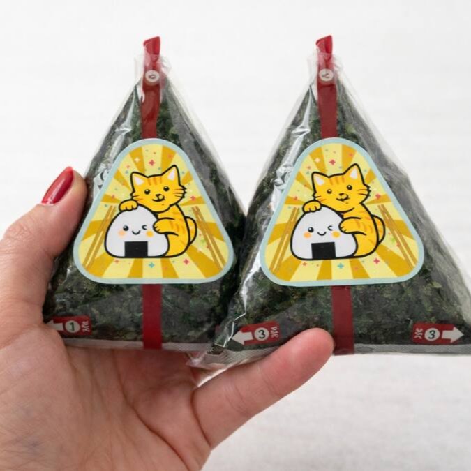 Triângulo de arroz gohan recheado com patê de salmão desfiado, envolto por alga nori!