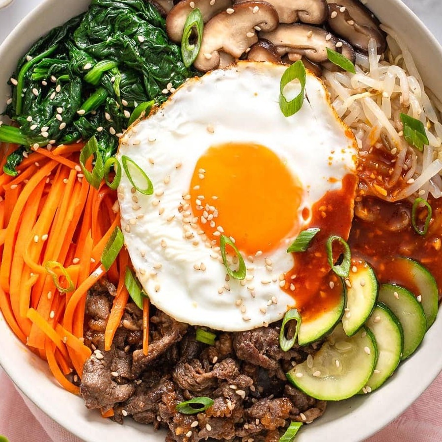 Prato tradicional com arroz, legumes frescos, carne temperada, ovo e molho picante. Misture tudo e aproveite essa delícia!