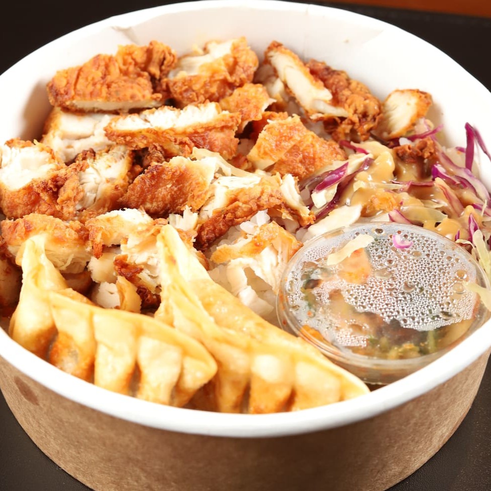 Pedaços de frango crocante com arroz, mandu, salada e kimchi de pepino.