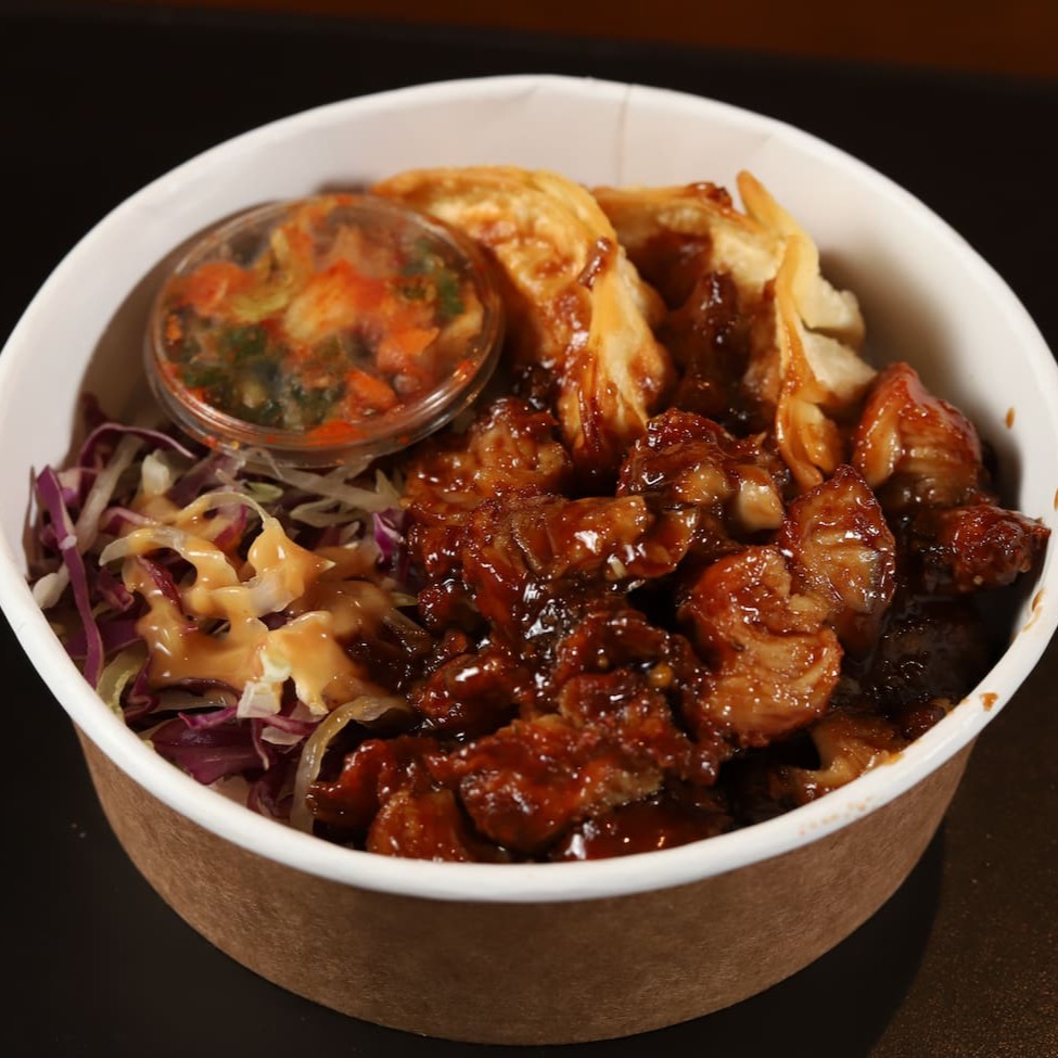 Pedaços de frango desossados caramelizados no molho black alho com arroz, mandu, salada e kimchi de pepino.