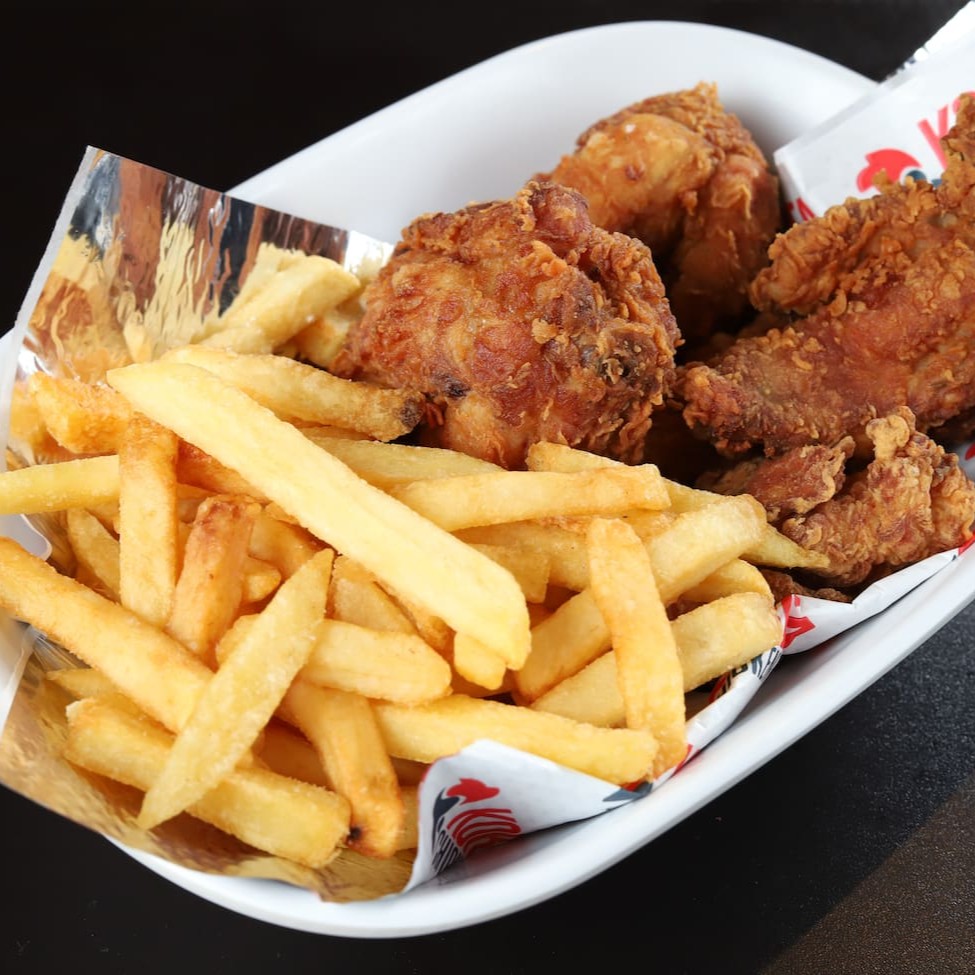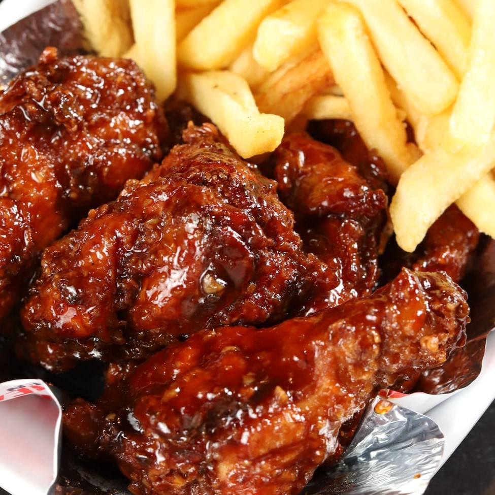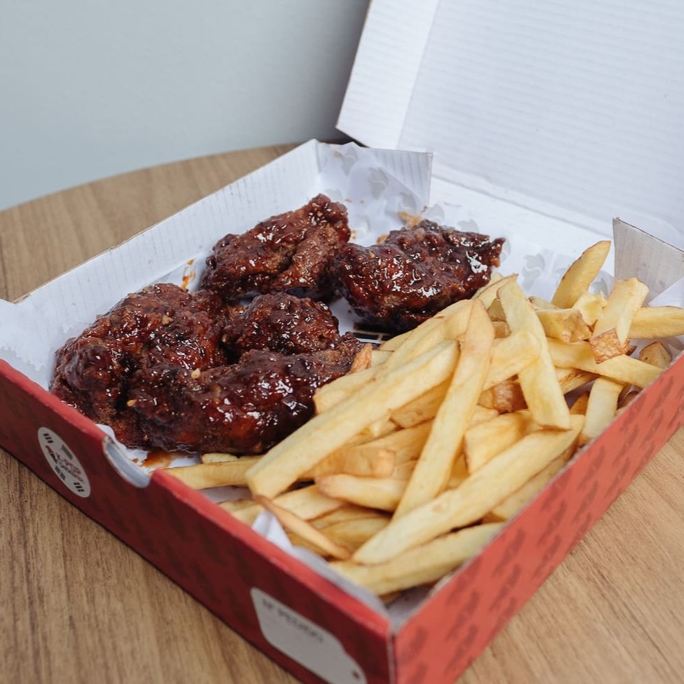 6 Suculentos pedaços de frango frito mergulhados em um molho coreano picante à base de gochujang e alho. Acompanha batata frita